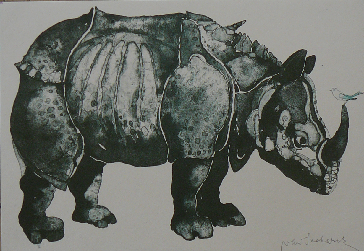 Nosorožec s ptáčkem barevná litografie, papír 18,3 x 25cm Cena: 1.500,-Kč